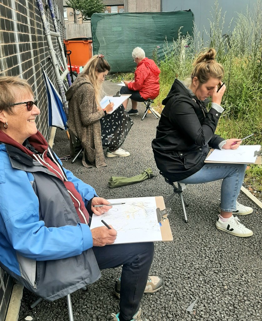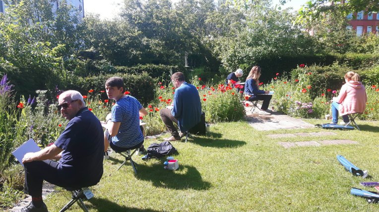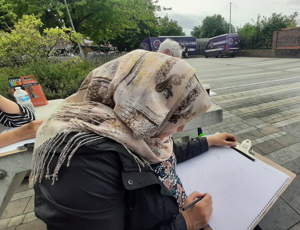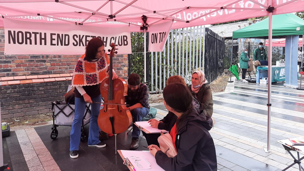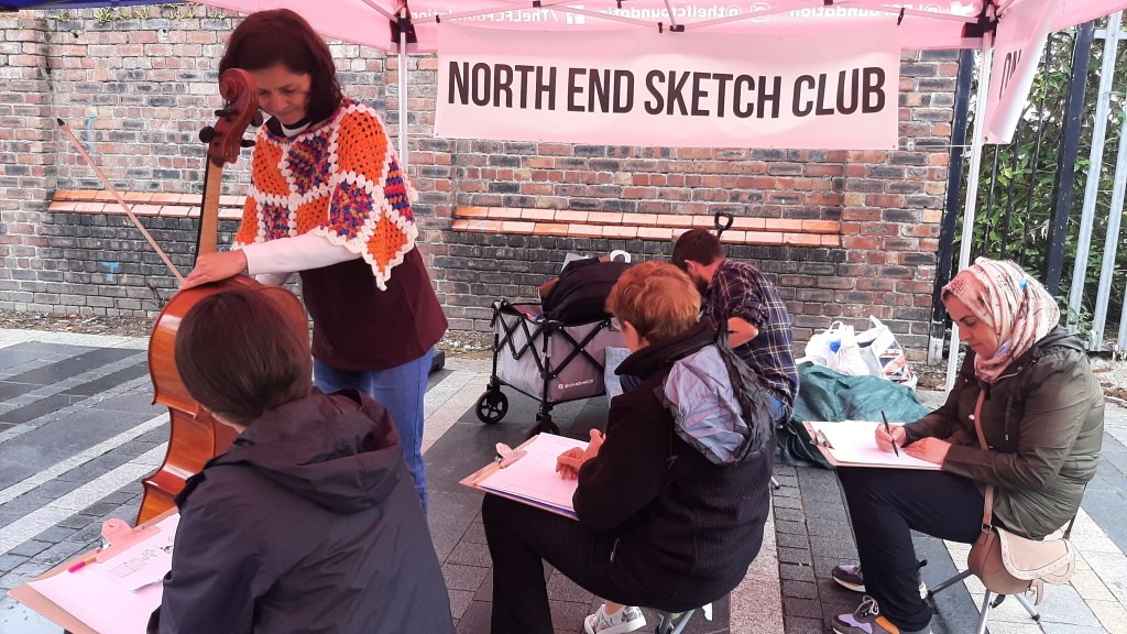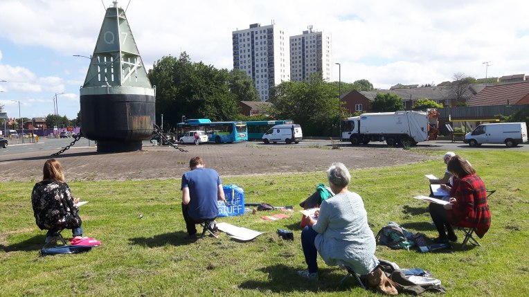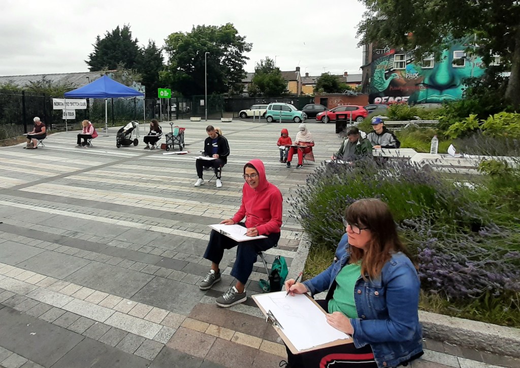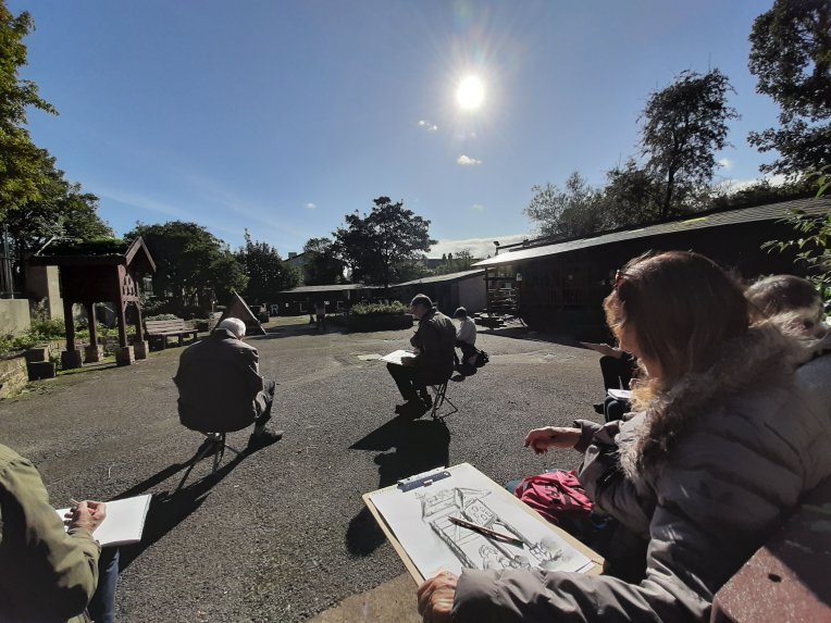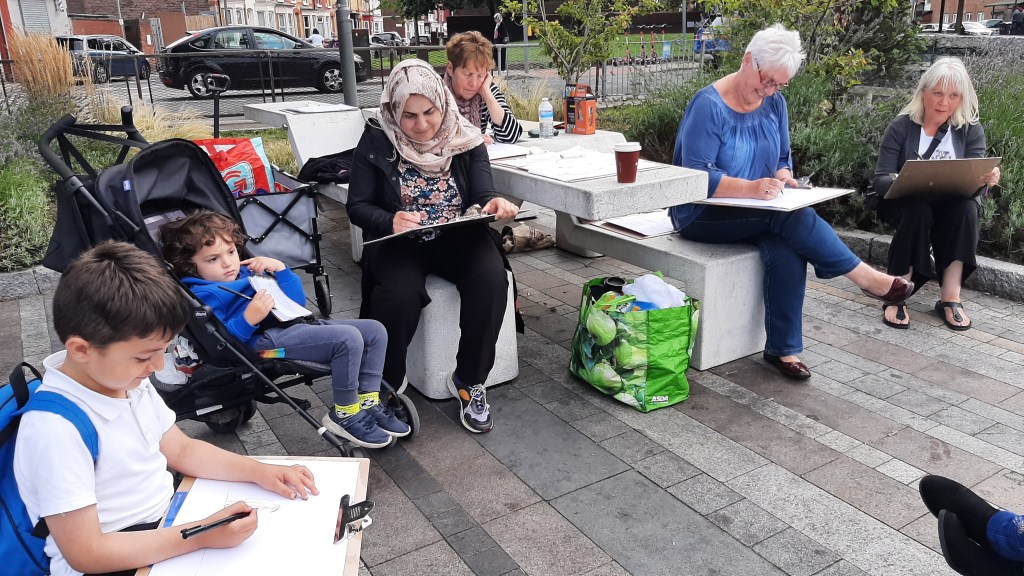 The beauty of the project is that it’s portable. It can go anywhere and work with anyone. There are no requirements needed, all materials are basic and provided, including portable stools! It suits people who’ve never sketched in their lives to established artists as there’s no judgment. The idea came after a period of intense grief after losing my Mum. I began sketching and realised that 10/20 minutes could pass by without realising, a tonic. It was the meditative quality I realised was the aspect worth sharing with others. Being a ‘club’ rather than a course leads to a laid back approach that anyone can drop into at any stage as there is no ‘teaching structure’, the sessions respond to the environment and the group itself.