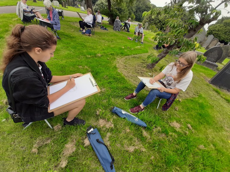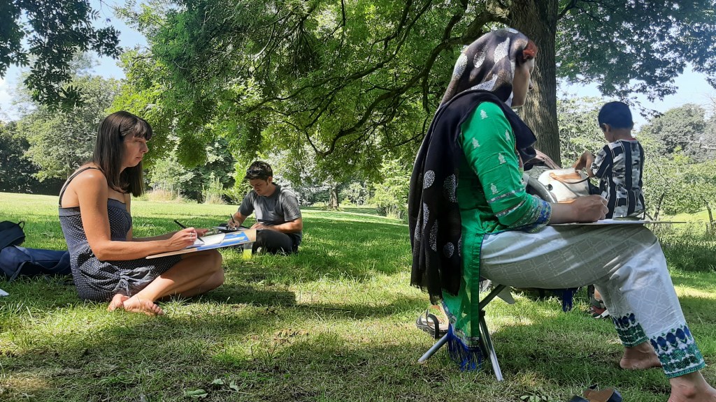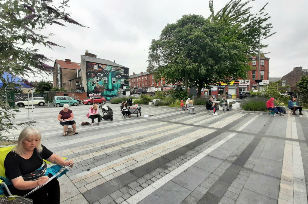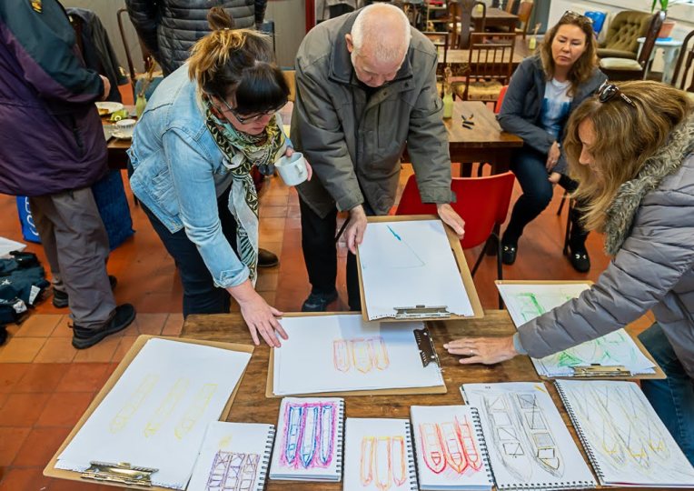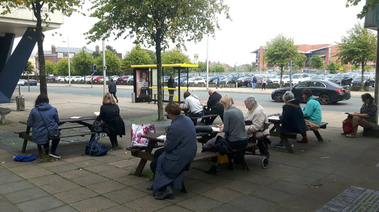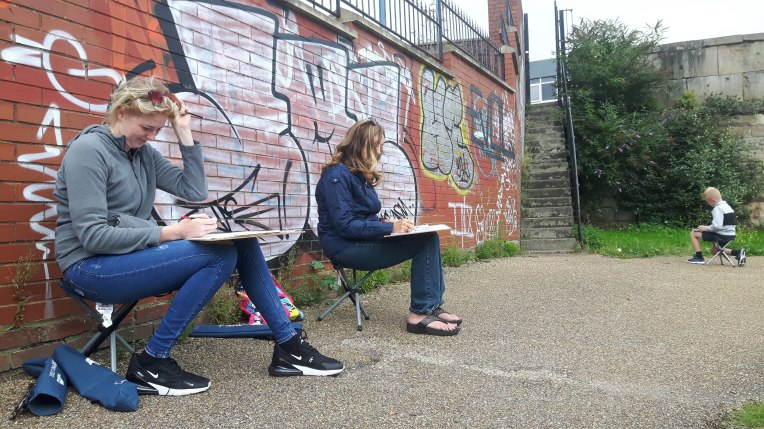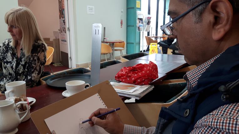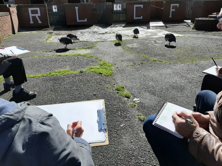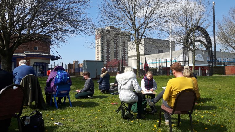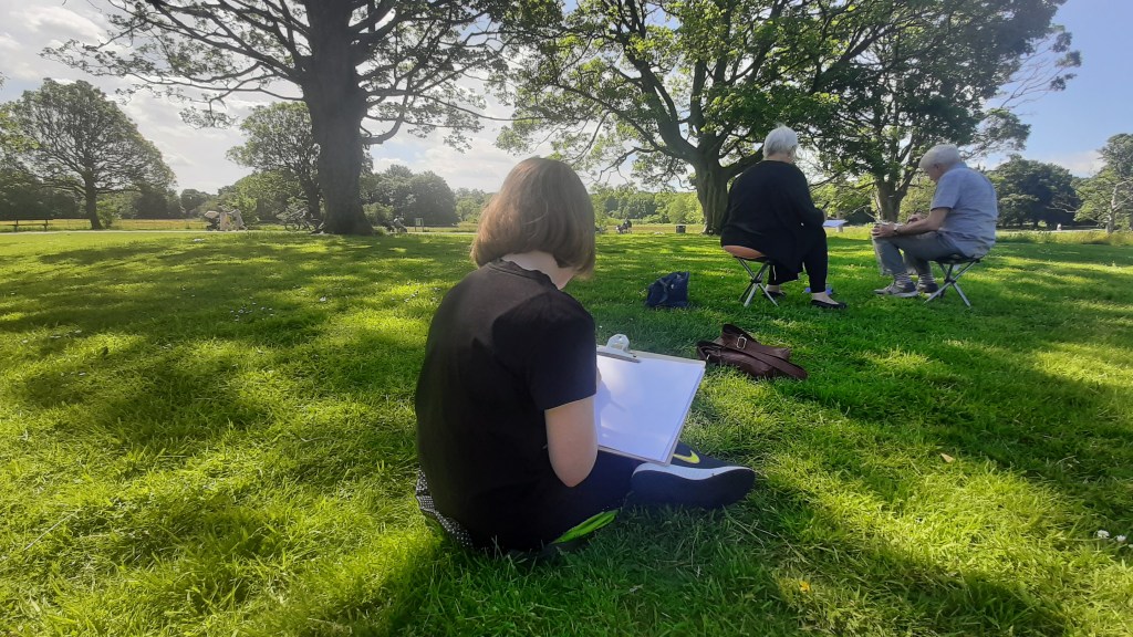 The beauty of the project is that it’s portable. It can go anywhere and work with anyone. There are no requirements needed, all materials are basic and provided, including portable stools! It suits people who’ve never sketched in their lives to established artists as there’s no judgment. The idea came after a period of intense grief after losing my Mum. I began sketching and realised that 10/20 minutes could pass by without realising, a tonic. It was the meditative quality I realised was the aspect worth sharing with others. Being a ‘club’ rather than a course leads to a laid back approach that anyone can drop into at any stage as there is no ‘teaching structure’, the sessions respond to the environment and the group itself.