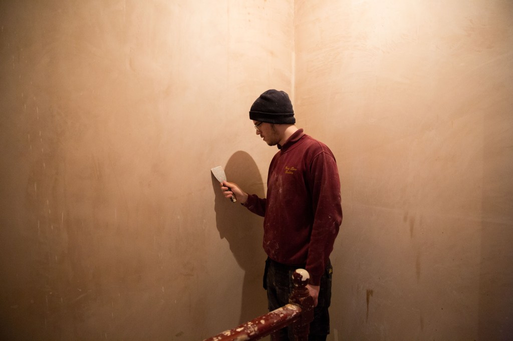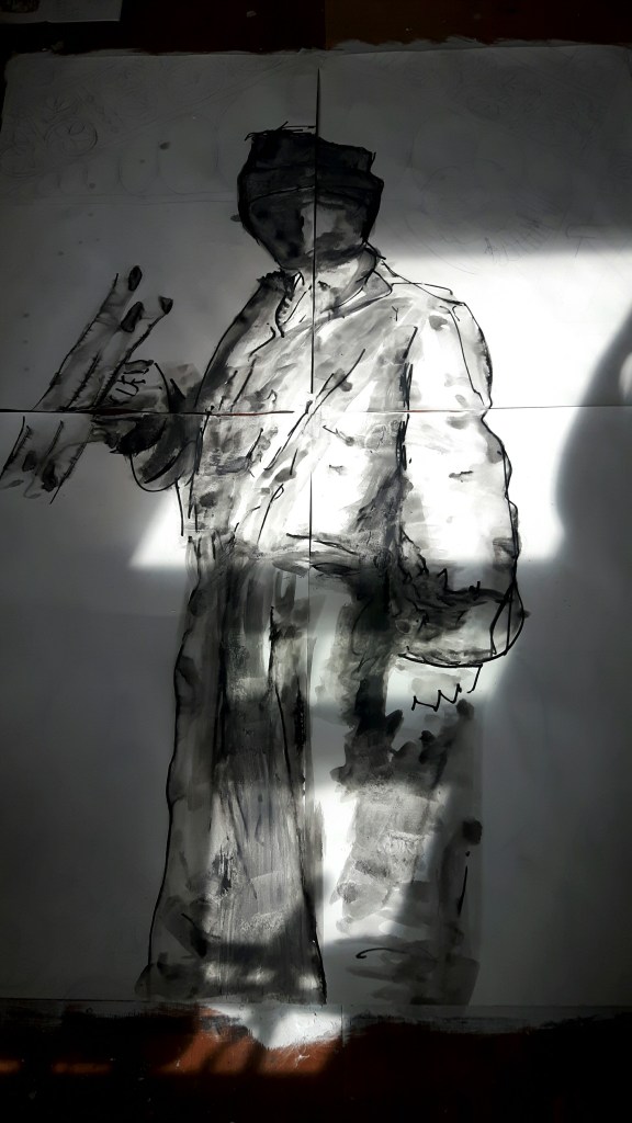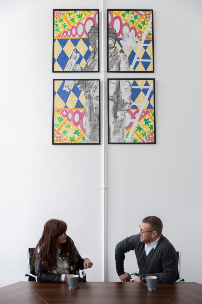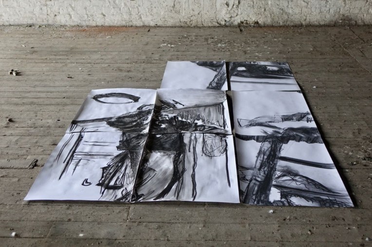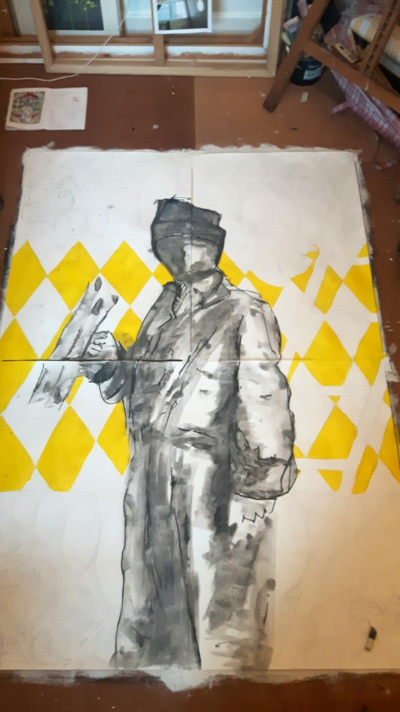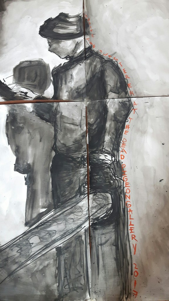 A series of 4 large scale paintings and drawings made in response to photographs by Jane MacNeil. We’d invited Jane to document building work, going on at the first house we redeveloped as part of the Coming Home project, where I was Artist in Residence at the time. The photographs by MacNeil sparked the idea for a show that would eventually be housed at the soon to be named, Dead Pigeon Gallery. Many of the photographs and one of the large scale paintings were bought by Penny Lane Builders, who employed the plasterers, and now hang in their head office.
