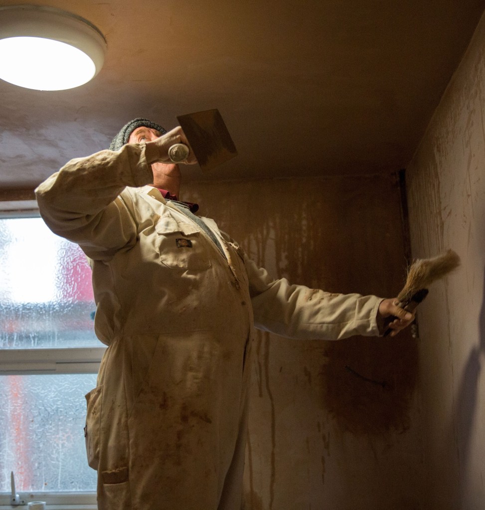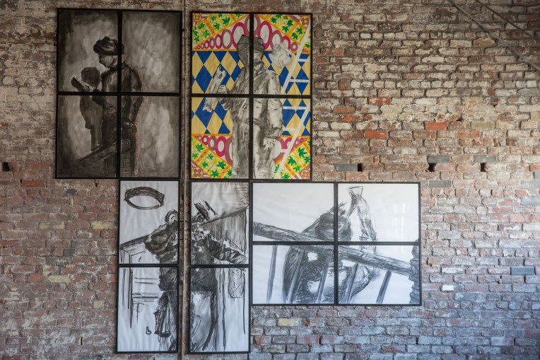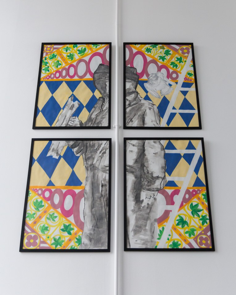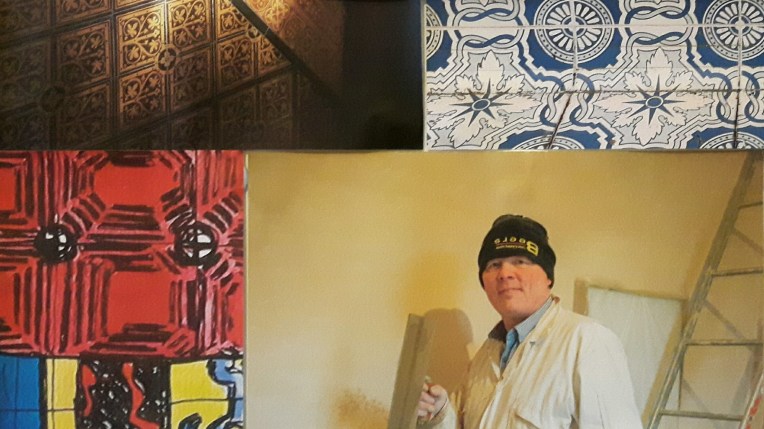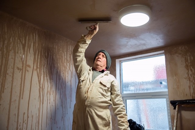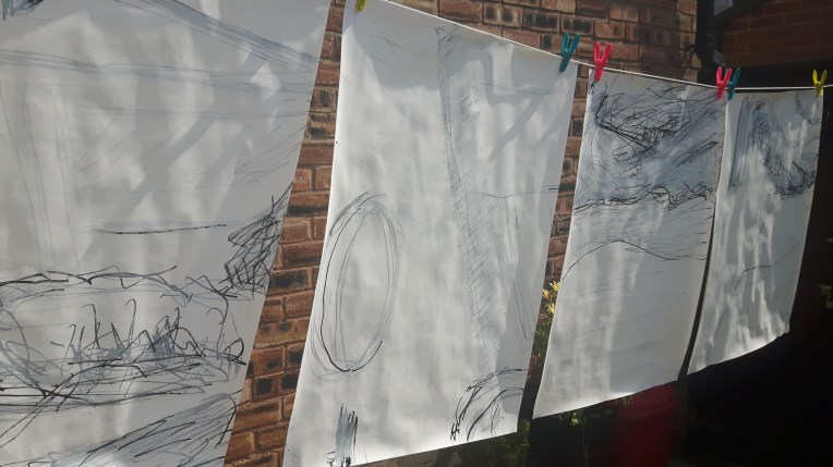 A series of 4 large scale paintings and drawings made in response to photographs by Jane MacNeil. We’d invited Jane to document building work, going on at the first house we redeveloped as part of the Coming Home project, where I was Artist in Residence at the time. The photographs by MacNeil sparked the idea for a show that would eventually be housed at the soon to be named, Dead Pigeon Gallery. Many of the photographs and one of the large scale paintings were bought by Penny Lane Builders, who employed the plasterers, and now hang in their head office.