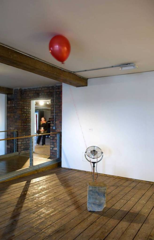 Part 1 is a concrete block with a red ribbon threaded through the middle with a helium balloon tied to the end, a motor fan directing jets of air at the balloon, meaning it’s able to move to some extent but always held back ultimately. This simply represents the thing that holds us back.